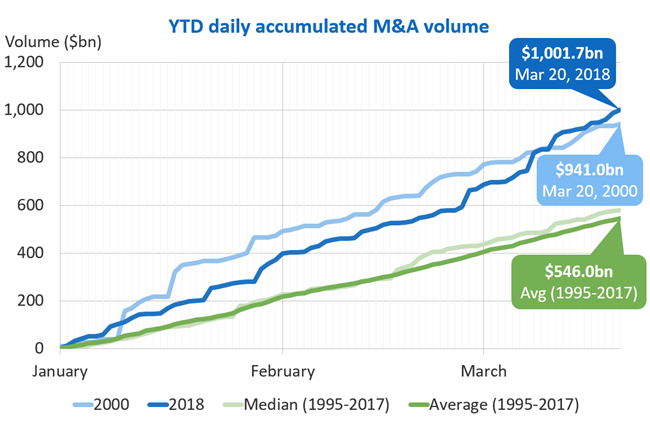 On the back of strong momentum from late 2017, YTD global announced M&A volume breached $1tr on March 20. This is the fastest start to a year ever, surpassing the previous record set in 2000 ($941.0bn) and significantly above the 23-year average YTD volume ($546.0bn).
