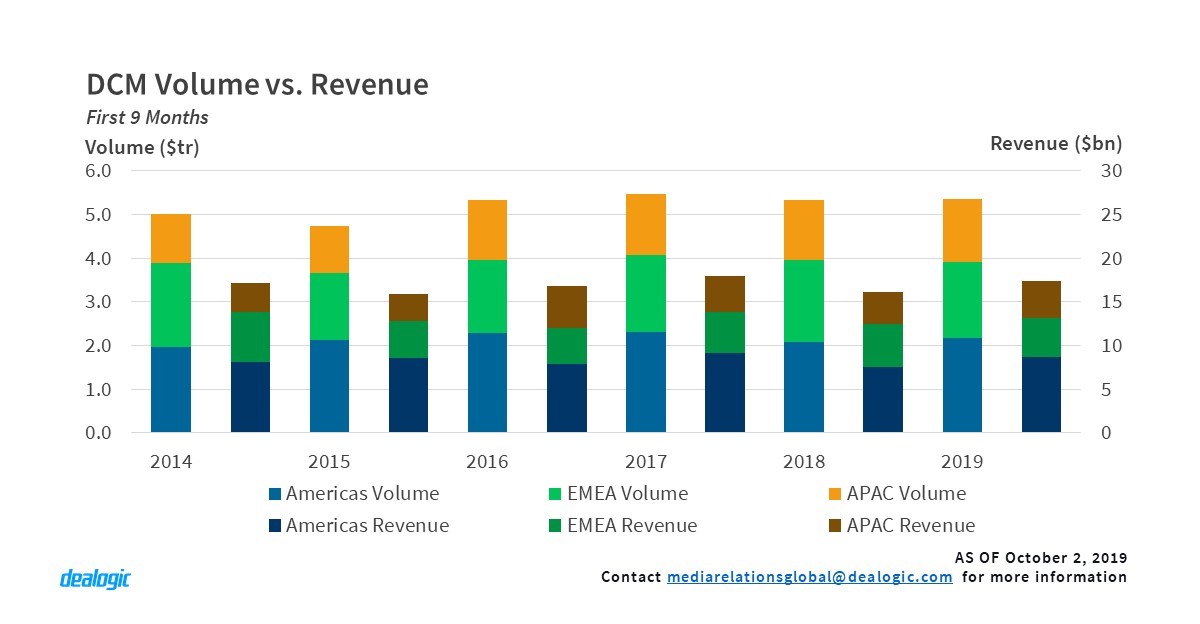After a busy start of the year bond pricing activity in EMEA started to slow down in the first half of the year. Issuance has continued to decline in the first nine months, with a total of $1.76tr worth of bonds placed with investors. The figure is 6% lower than the same period in the past year and outlines the challenges debt markets face in the region. The ECB keeps battling with a lukewarm European economy and considers lending as a critical pillar to spur growth. As a result, interest rates in the region remain at very low levels and the central bank is re-opening quantitative easing stimulus.
