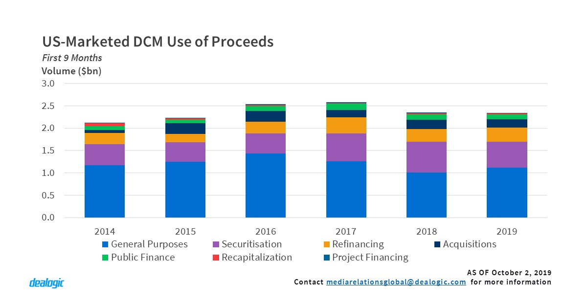 So, where are all these funds going? Aside from the usual general company spending and securitisation proceeds we find refinancing the top priority for issuers. A total of $319.9bn of funds settled via US-marketed bonds were used to pay off other liabilities. Amongst other firms, Walt Disney, UnitedHealth Group, PEMEX, Altice and Tenet Healthcare priced large transactions in the third quarter of the year to pay upcoming debt maturities. These refinancing efforts were not only pursued by investment grade corporations ($187.6bn), but also by high-yield firms: $126.5bn of junk credit was brought to the market to recycle low-rated debt. The total non-investment grade portion of the US market grew by 31% to $237.6bn in the first nine months of the year, and the leverage finance portion also went up by 33% to 196.8bn. With US leveraged loans declining significantly high-yield bonds are gaining back funding capacity below the triple-B line.