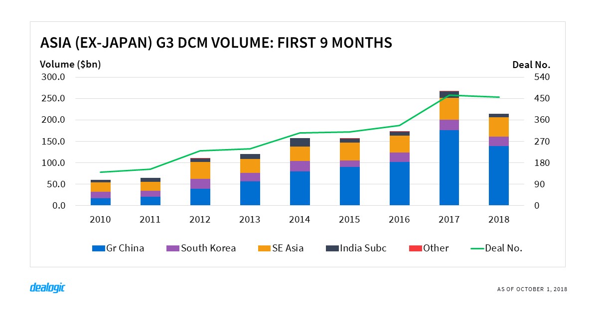 While other countries have faced tough conditions, South Korean issuance has been running at a strong pace with first 9 months volume totaling $22.4bn and just 8% shy of the level reached in the same period in 2017. The country has benefitted from a stable economy and signs of reduced tension with North Korea, with volume only slowing down ahead of the inter-Korean summit in September.