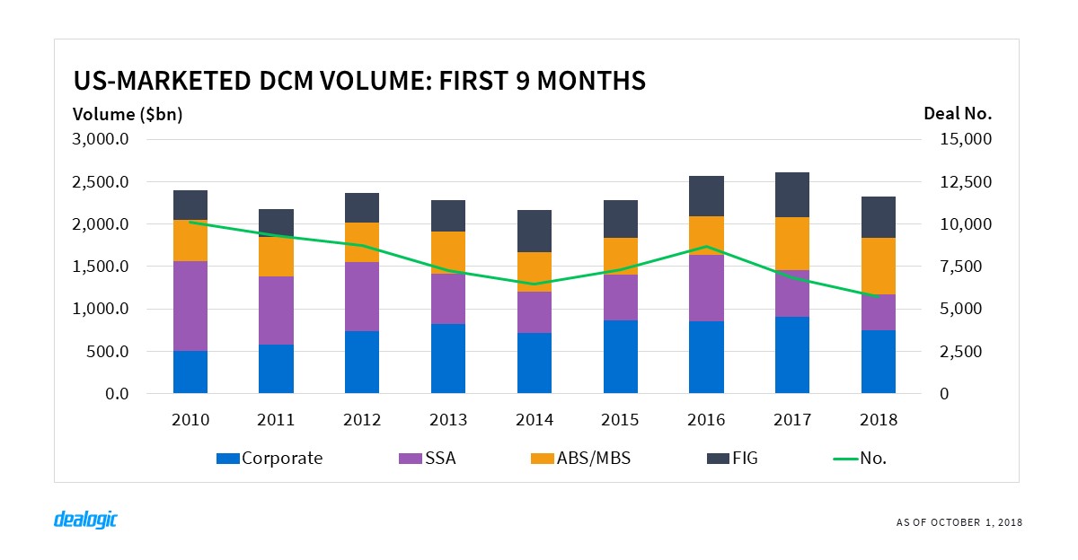 The deterioration of US dollar bond issuance has not only affected Americas volume but also the US bond market. Total US-marketed issuance is down 11% year-on-year to $2.32tr. The decline in bond volume can be attributed to both corporates and sovereign borrowers. The latter group has seen the most significant cut in bonds sales, shrinking to $423.8bn in the first 9 months of 2018 from $545.8bn in the same period last year. Of the volume issued this year 46.0% was issued by US entities, leaving the majority of issuance to foreign SSAs. There has been a progressive decline in issuance from US agencies over the years—from an 85.5% share in the first 9 months of 2010 to 46.8% by the same period in 2017—and highlights how important the US dollar remains to foreign institutions.