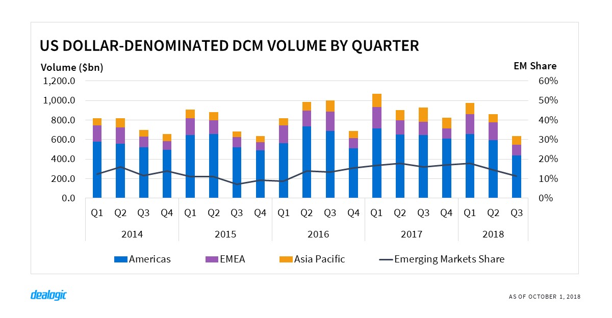 Bond activity continued to be constrained by interest rate hikes and other factors, such as the repatriation tax overhaul that has affected US dollar issuance. The third quarter saw a tepid $702.0bn printed in US dollars from 1,784 deals—a 10-year low for quarterly deal activity. Amidst this environment, USD issuance in the first 9 months totaled $2.45tr, down 13% and 10% from 2017 and 2016 levels respectively.