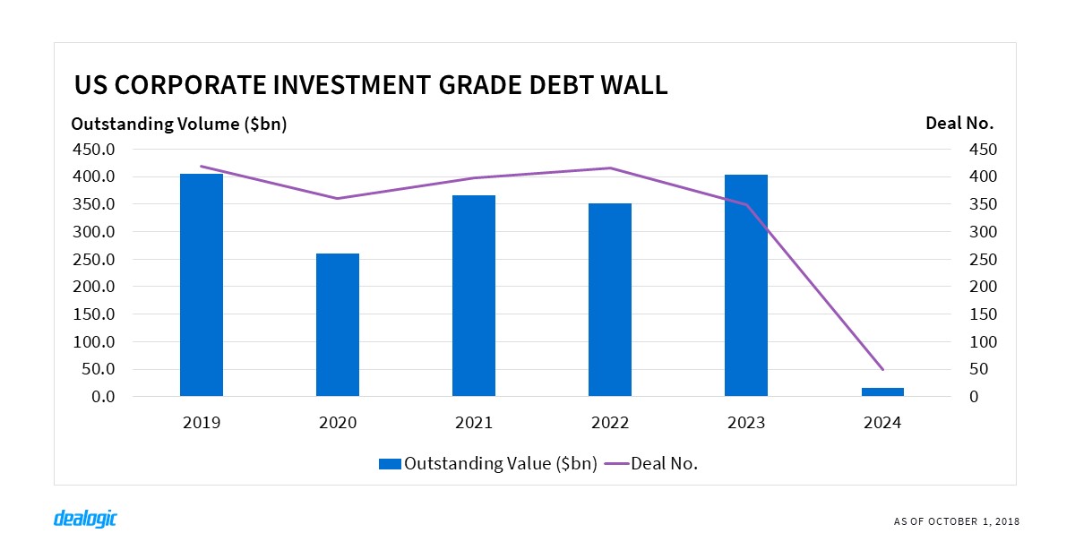 US corporate investment grade volume in Q3 2018 stood at $215.3bn, up by $19.2bn from Q3 2017, but activity plunged to 152 deals from 190 over the same period. While refinancing and amendments accounted for the lion’s share of use of proceeds with a 65.7% share in the first 9 months, new acquisitions nearly doubled to $229.6bn from the $122.8bn reported in the same period last year. The significant year-on-year volume increase to $843.5bn in the first 9 months of the year ($572.5bn in the first 9 months of 2017) paves the way for future refinancing opportunities. By the year 2023, there will be a total of $1.79tr worth of US corporate investment grade debt outstanding.