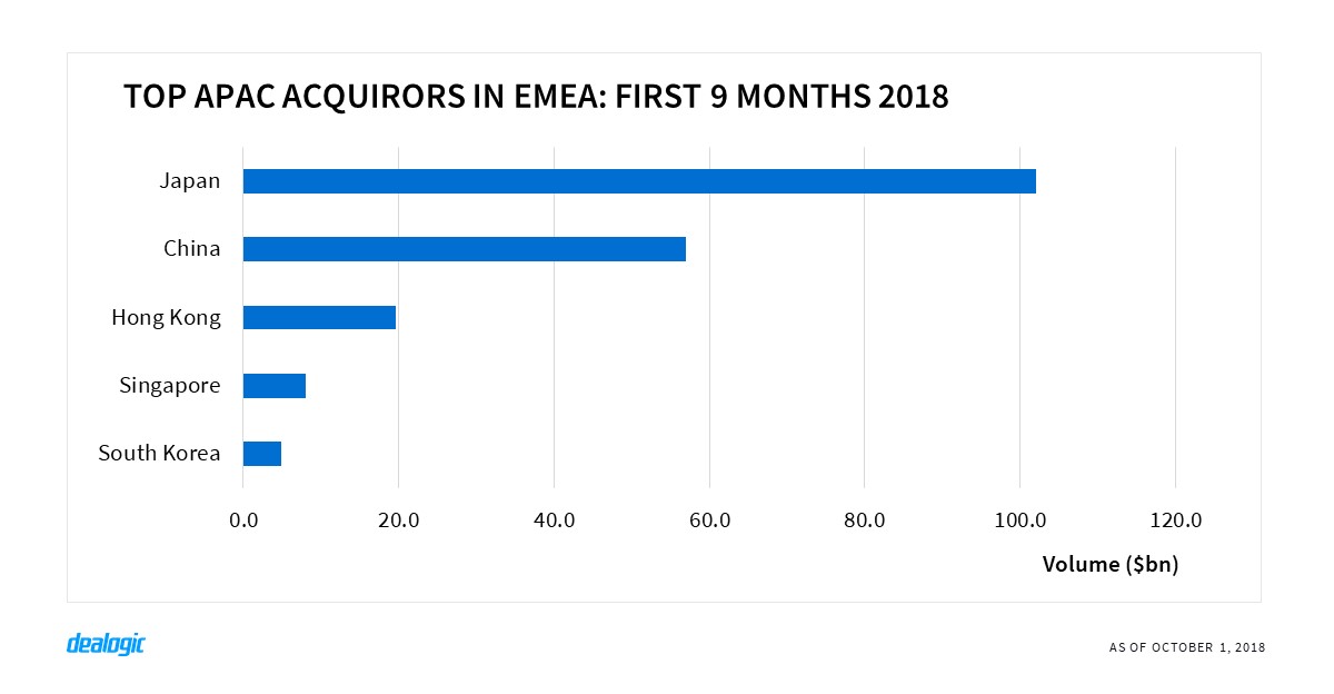Despite the general drop in global M&A activity in the first 9 months, transactions involving an Asia Pacific-based company totaled $1.07tn via 10,749 deals—the highest first-9-months level on record. Asia Pacific companies and investors continued to target EMEA-based businesses, with cross-border volume also setting a record of $202.8bn and was up 162% compared to the same period in 2017.