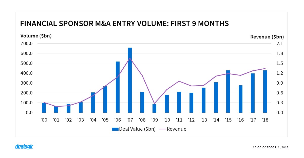 Financial sponsor entry volume has climbed steadily this year, totaling $427.9bn via 2,199 deals—the highest first-9-months level since 2007 ($657.8bn via 3,338 deals). This also represented a year-on-year 8% increase in volume and an 11% decline in deal activity.