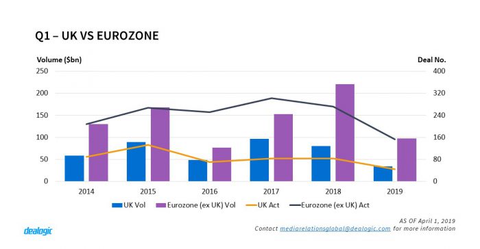 Brexit tremors have undeniably impacted Europe’s volume which fell year on year by 55.2% whilst the 240 deals recorded are the lowest quarter since Q1 2009. The level of uncertainty particularly impacted Europe’s M&A financing volume which slumped by 70.9% from $157.2bn last year to only $47.8bn. Similarly, refinancing also fell by nearly $70.0bn from Q1 2018. UK loans volume which totaled $33.9bn via 44 deals witnessed its lowest Q1 since 2012 ($26.1bn via 60 deals). It is important to note that 28.0% of the UK’s Q1 volume was driven by GlaxoSmithKline’s $9.5bn acquisition financing of Tesaro. Most of the UK activity was centered around refinancing. Furthermore, facilities syndicated in the UK are heavily skewed towards investment grade with 77.7% of volume whilst leveraged activity fell from 28 deals in Q1 2018 to only 11 in Q1 2019. The Eurozone (excl. UK) had a similar fate with activity crumbling from 271 deals to only 153 facilities and volume plunging from $220.8bn in 1Q 2018 to merely $97.0bn.